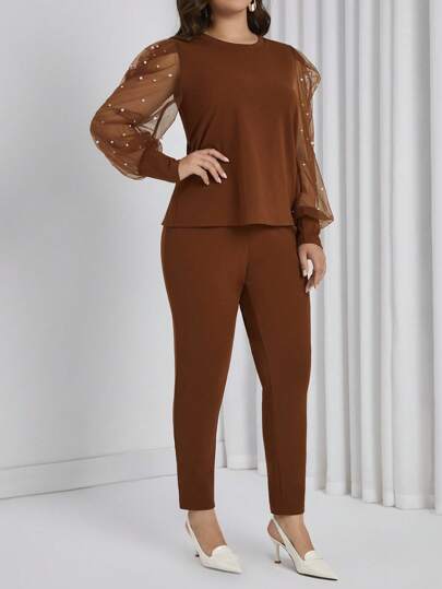 SHEIN Privé 女式加大码圆领网眼拼接上衣和修身长裤两件套 - 鏽棕色 - 查看 1