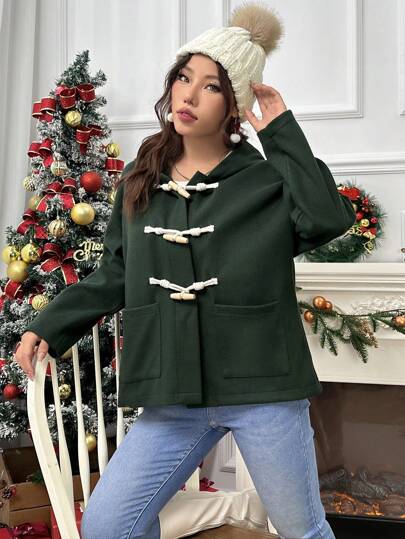 SHEIN Unity 雙口袋落肩袖行李袋連帽行李袋粗花呢行李袋粗花呢粗呢大衣 - 綠色 - 查看 1