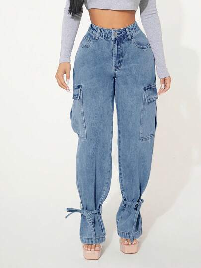 SHEIN SXY 有蓋口袋側結下擺工裝牛仔褲 - 中等水洗藍 - 查看 5