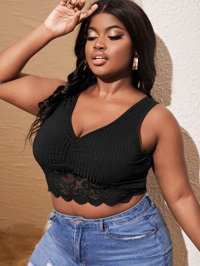 Slaydiva 大碼蕾絲拼接褶邊貝殼邊背心上衣 - 黑色 - 查看 3