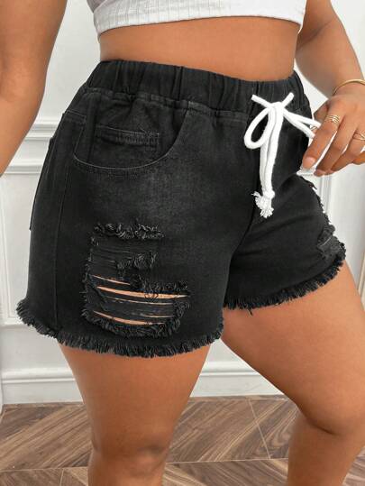 SHEIN SXY 大碼腰部抽繩破洞毛邊緣牛仔短褲 - 黑色 - 查看 1