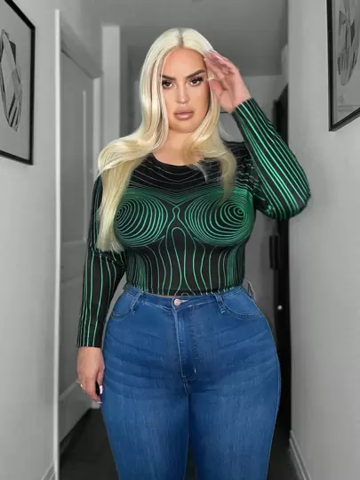 SHEIN SXY 大尺碼女條紋長袖 T 卹 - 黑色 - 查看 1