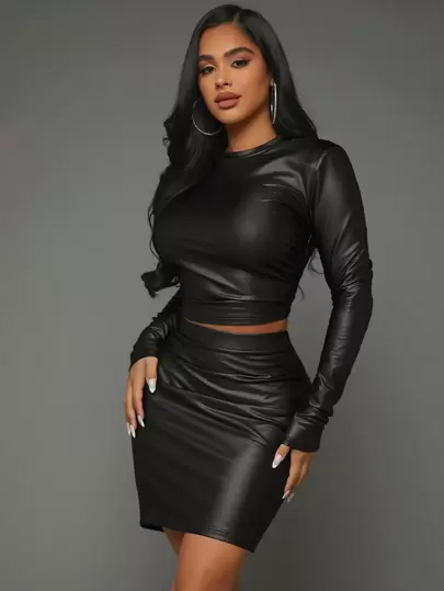 SHEIN SXY 素色短款PU皮革上衣&包臀半身裙 - 黑色 - 查看 1
