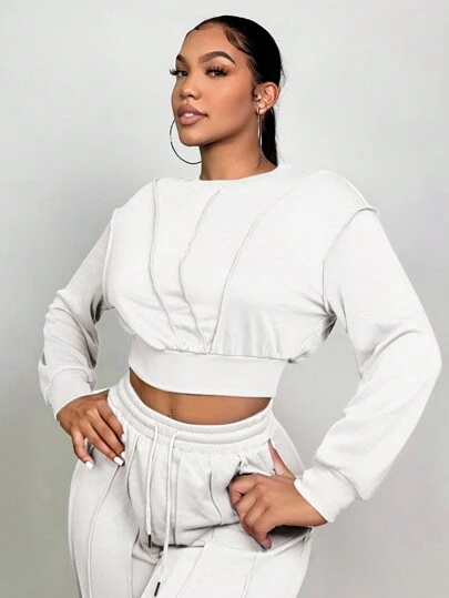 SHEIN SXY 女士純色垂墜肩短款運動衫 - 白色 - 查看 1