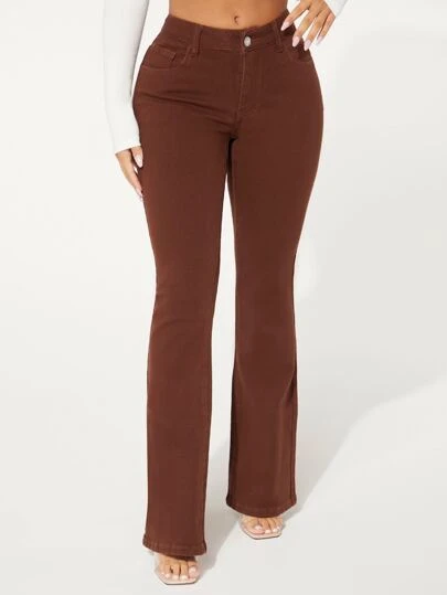 SHEIN SXY 拉鏈門襟牛仔喇叭褲 - 鏽棕色 - 查看 1
