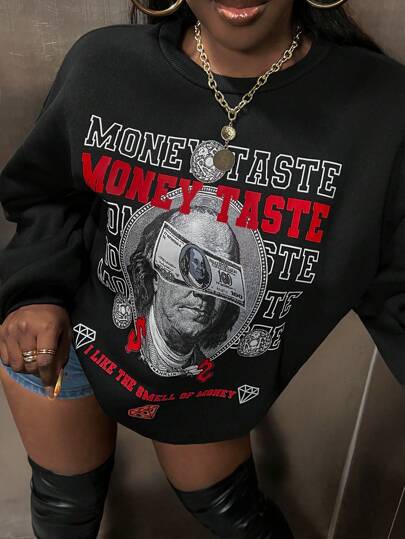 Slaydiva 休闲人物与字母图案落肩女式运动衫 - 黑色 - 查看 1