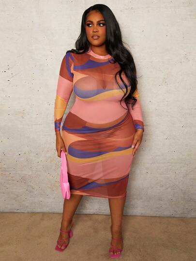 Slaydiva 大碼立領長袖透視連衣裙 - 橘色 - 查看 1