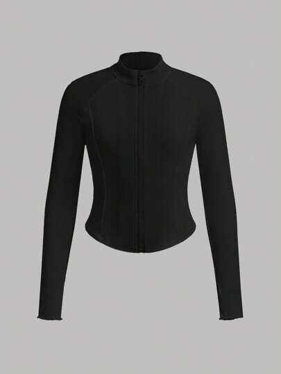SHEIN Sparklyn Tween 女童白色修身短款拉链夹克,春秋季 - 黑色 - 查看 1