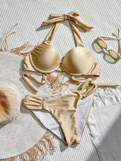 女士纯色褶皱分体吊带比基尼套装夏季海滩 - 卡其色 - 查看 1
