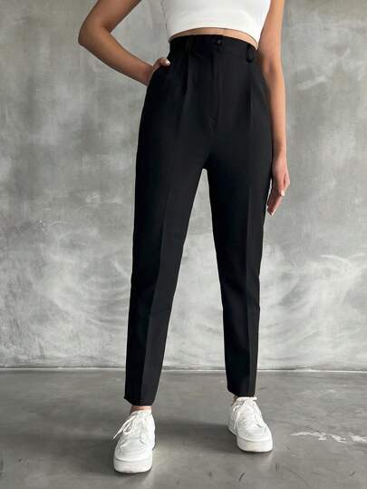 SHEIN Tall 高腰褶皺西裝褲 - 黑色 - 查看 1