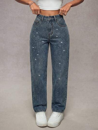 SHEIN Tall 高腰斜插口袋水钻装饰水洗牛仔锥形裤 - 中等水洗藍 - 查看 1