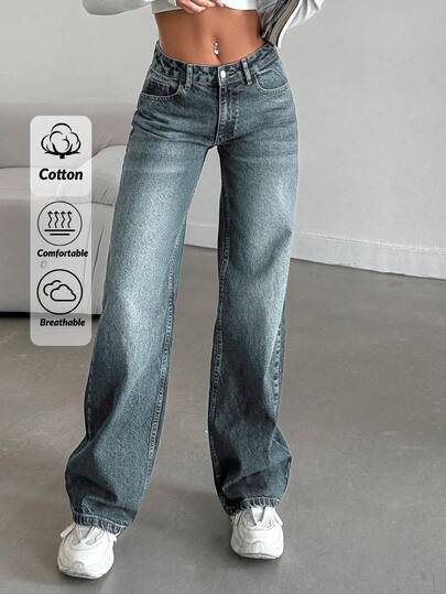 SHEIN Tall 女士休闲水洗低腰直筒牛仔裤 - 霧霾藍 - 查看 1