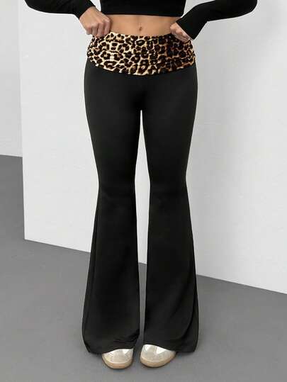 SHEIN Tall 女士时尚休闲豹纹喇叭裤 - 黑色 - 查看 1