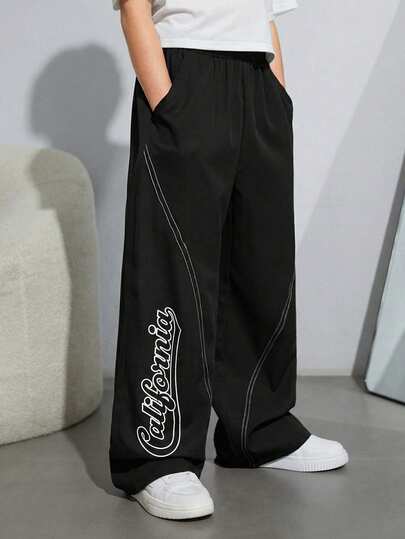 SHEIN 青少年男童休闲运动字母印花撞色条纹宽松梭织长裤