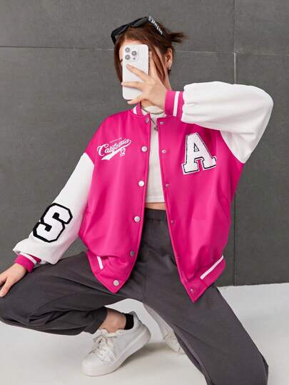 SHEIN 少女字母圖案下肩兩色對比運動外套 - 玫紅色 - 查看 1