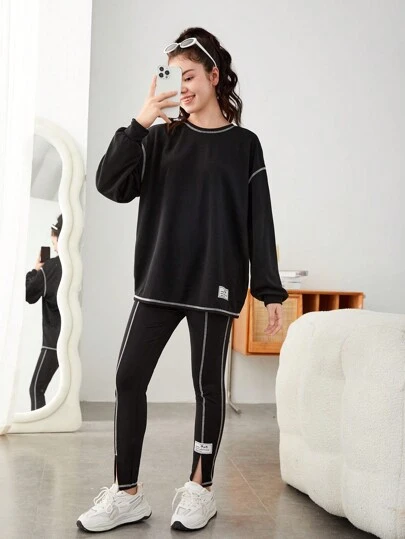 SHEIN 青少年女孩字母貼布頂針落肩袖套頭衫&緊身打底褲 - 黑色 - 查看 1