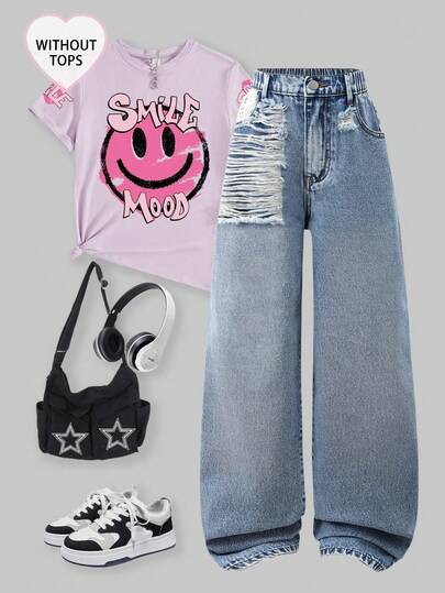 SHEIN 少女款破洞宽松阔腿休闲牛仔裤,复古美式风格 - 中等水洗藍 - 查看 1
