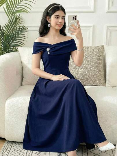 SHEIN 少女藏蓝色交叉领口收腰A字长款派对礼服/正式礼服 - 寶藍色 - 查看 1