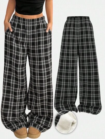 SHEIN 少女格纹保暖内衬休闲运动裤 - 黑與白 - 查看 1