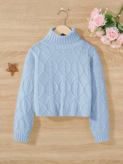 SHEIN Tween 女孩休閒寬鬆高領長袖絞花針織毛衣 - 淺藍色 - 查看 1