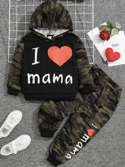 SHEIN 男童可愛舒適英式印花拼色迷彩連帽衫與運動褲套裝 - 黑色 - 查看 1