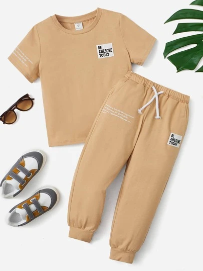 SHEIN 小男童標語圖案貼布細節T恤和運動褲 - 杏色 - 查看 1