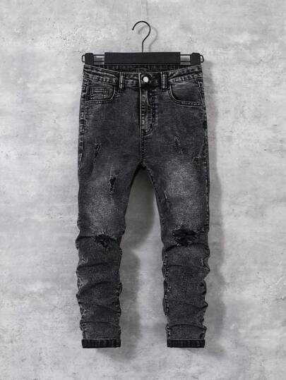SHEIN Tween Boy 黑色破洞牛仔裤 - 黑色 - 查看 1