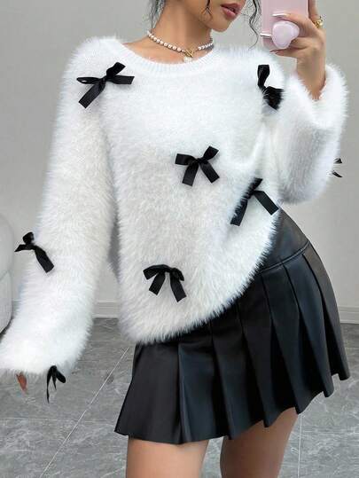 SHEIN 青少年女孩休闲可爱圆领仿毛领宽松蝴蝶结针织毛衣上衣 - 白色 - 查看 1