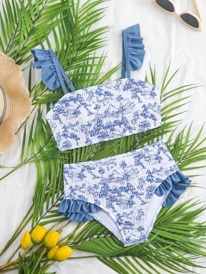 SHEIN Tween Girl 花卉印花荷叶边比基尼泳装套装 - 彩色 - 查看 1