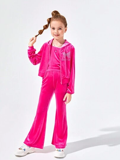 SHEIN 女大童水鑽字母圖案連帽絲絨夾克和喇叭褲和吊帶上衣 - 玫紅色 - 查看 1