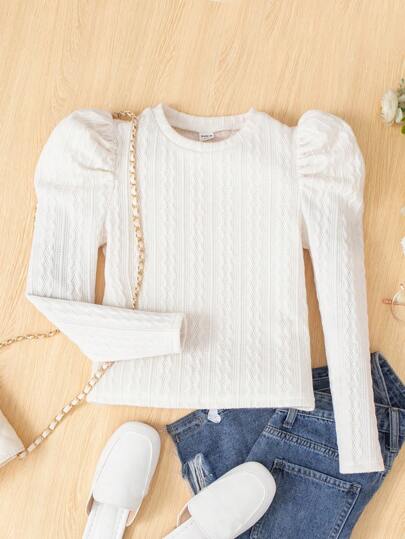 SHEIN 女大童素色羊腿袖T恤 - 白色 - 查看 1