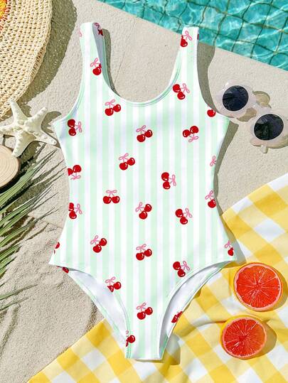 SHEIN 少女休闲简约吊带连体泳衣,适合夏季穿着 - 彩色 - 查看 1