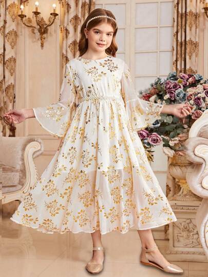 SHEIN Leap Crew 青少女可愛的度假風格圓領中長裙,帶有傘袖 - 彩色 - 查看 1
