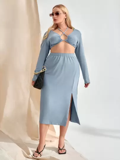 SHEIN Unity 大碼繞頸短款上衣和開衩半身裙 - 霧霾藍 - 查看 1