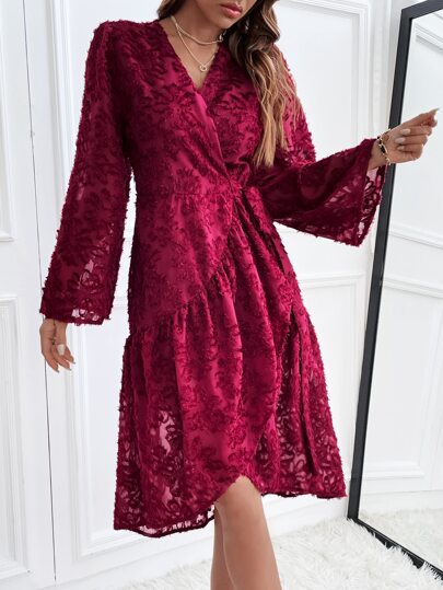 SHEIN Unity 喇叭袖荷葉邊側繫帶毛茸茸圍裹式洋裝 - 酒紅色 - 查看 1