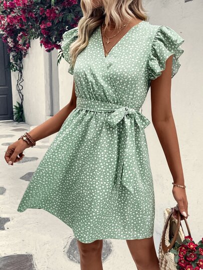Breezaya 滿版心形印花蝴蝶袖繫腰帶洋裝 - 綠色 - 查看 1