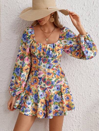 SHEIN VCAY 花卉印花燈籠袖褶皺胸圍荷葉邊下擺連衣褲 - 彩色 - 查看 1