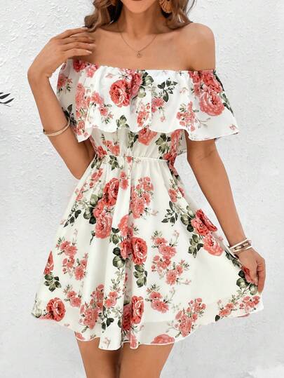 SHEIN VCAY 露肩花卉印花度假連身裙 - 白色 - 查看 1