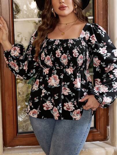 SHEIN VCAY 大碼印花燈籠袖荷葉邊下擺襯衫 - 彩色 - 查看 1
