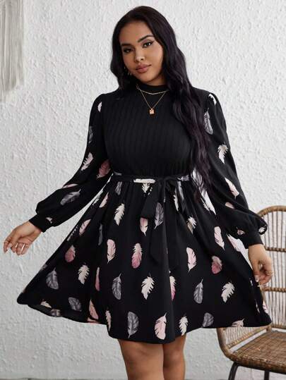 SHEIN VCAY 大尺寸羽毛印花束帶連身裙 - 彩色 - 查看 1