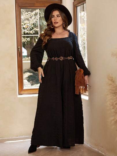 SHEIN VCAY 大碼方領燈籠袖闊腿連體褲不附腰帶 - 黑色 - 查看 1