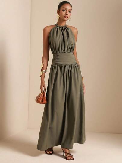 SHEIN Veneréa 女士纯色褶裥腰部时尚吊带连衣裙,适合度假穿着 - 橄欖綠 - 查看 1
