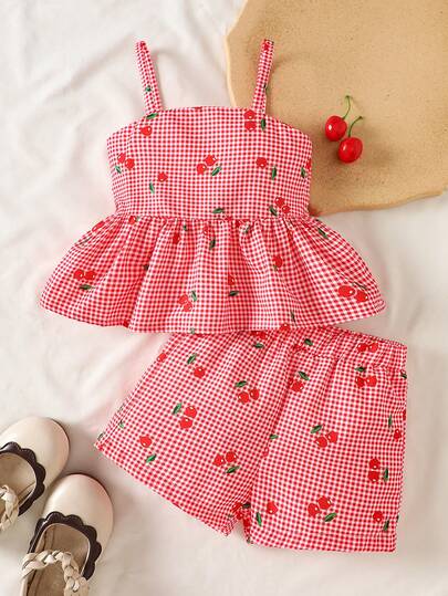 SHEIN Vintaside Kids 2件套女婴春夏度假风樱桃格子印花吊带上衣和短裤 - 紅色 - 查看 2