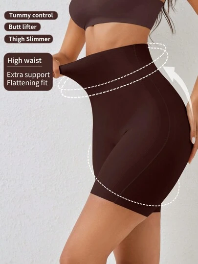 SHEIN 女士纯色高腰休闲修身塑身裤、内裤 - 咖啡棕 - 查看 1