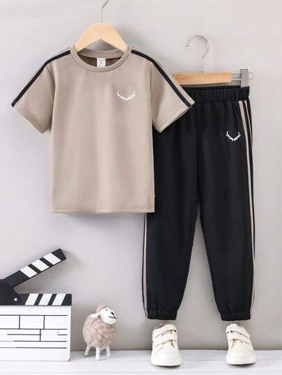 SHEIN 男小童鹿角圖案織帶拼接T恤和運動褲 - 彩色 - 查看 1