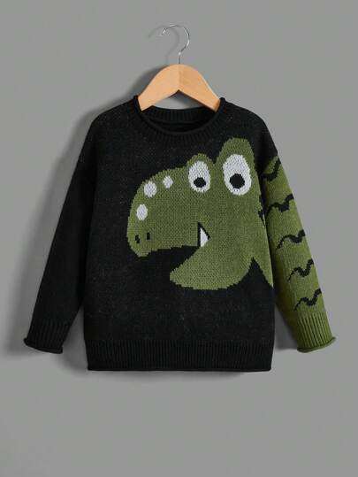 SHEIN 男小童卡通鱷魚紋落肩袖套頭毛衣 - 黑色 - 查看 1