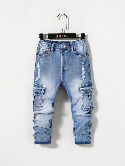 SHEIN 男孩休閒中腰不規則剪裁破壞牛仔褲 - 中等水洗藍 - 查看 1