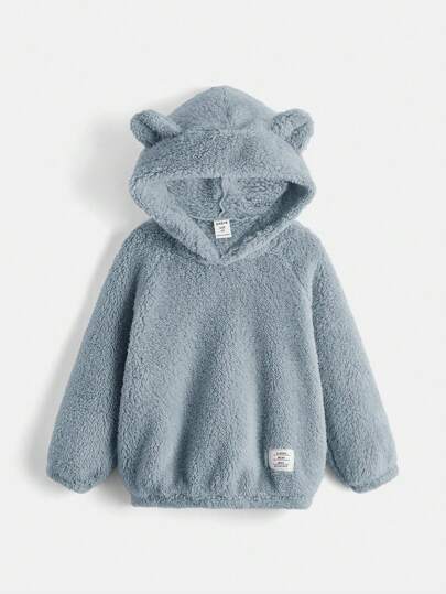 SHEIN 年輕男孩字母補丁細節3D耳朵設計毛絨帽衫 - 藍色 - 查看 1