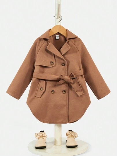 SHEIN 女小童雙排釦插肩袖腰帶花呢外套 - 棕色 - 查看 1