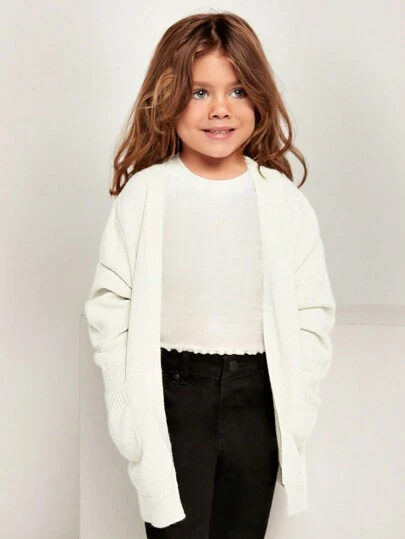 SHEIN 秋冬款少女纯色落肩双口袋长袖开衫 - 白色 - 查看 1